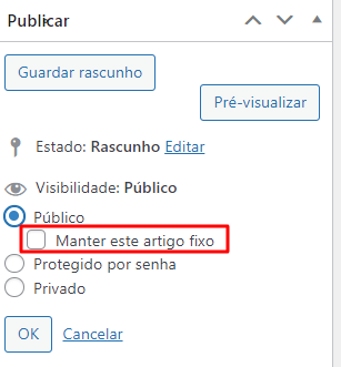 Dentro da caixa "Publicar", você encontrará uma opção chamada "Visibilidade", que está configurada por padrão para "Público". Clique em "Editar" ao lado de "Visibilidade" para ver mais opções. Aqui, você encontrará uma caixa de seleção intitulada "Manter este artigo fixo na página inicial". Marque essa caixa para ativar a funcionalidade.