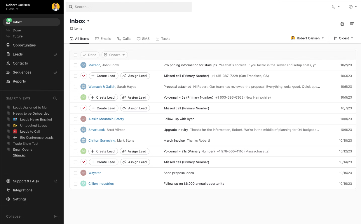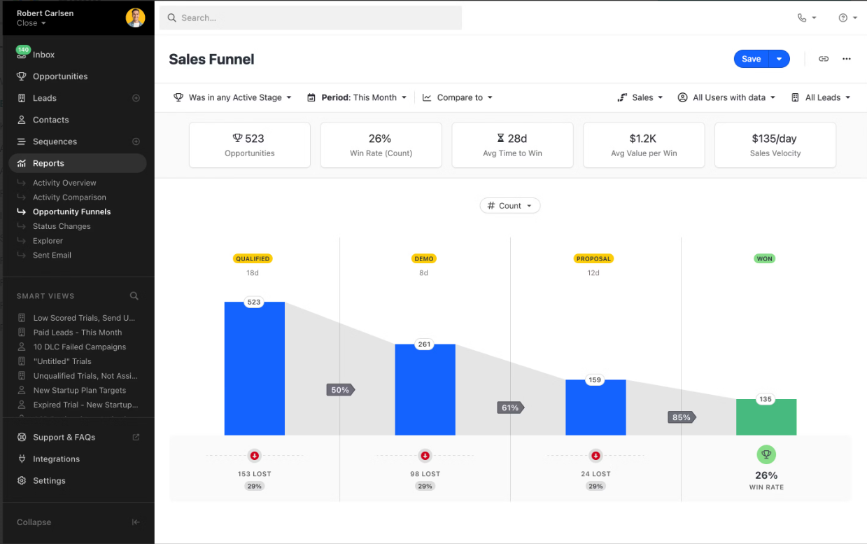 - O Close CRM oferece recursos de rastreamento de leads, permitindo que as empresas acompanhem o progresso de seus leads e aproveitem melhor suas oportunidades de negócios.
