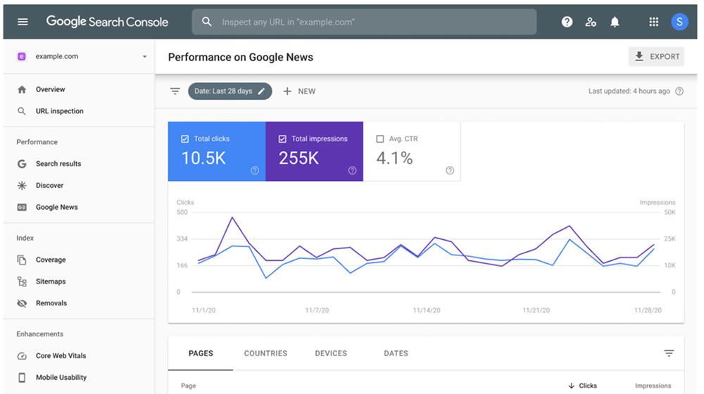 A visão geral do painel fornecerá uma síntese dos dados essenciais do seu site, como cliques, impressões, taxa de cliques (CTR) e posição média nas pesquisas. Poderá visualizar os dados em um período de tempo específico e ver como eles mudaram ao longo do tempo.